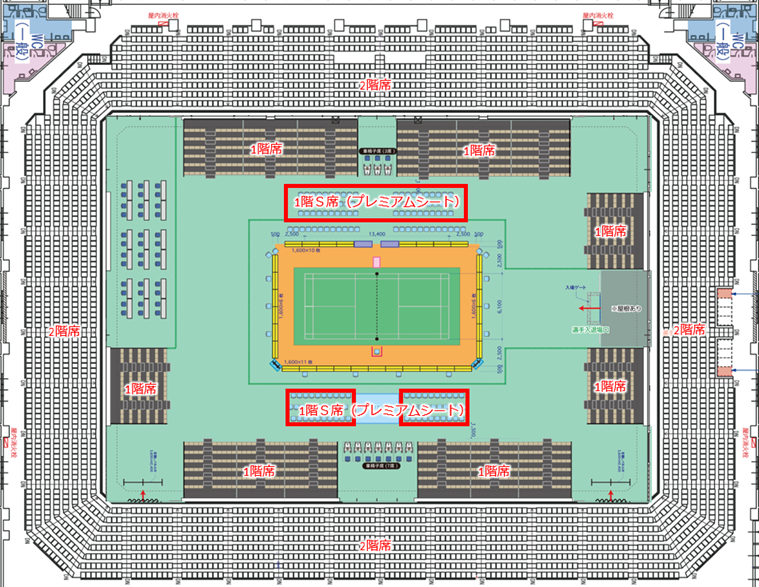 - ・競技と同階のフロア・およびフロアに設けられた客席(アリーナ席、アリーナサイド席)では試合中は不可とする。